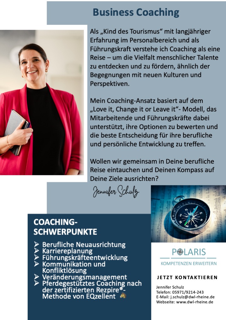 Zudem bieten wir die Möglichkeit, maßgeschneiderte Inhouse-Seminare oder Coachings für Mitarbeitende und Führungskräfte zu buchen, die wir direkt bei dir vor Ort durchführen. Du möchtest mehr erfahren oder uns persönlich kennenlernen? Kontaktiere uns für weitere Informationen und individuelle Terminabsprachen über info@polaris-trainings.de.